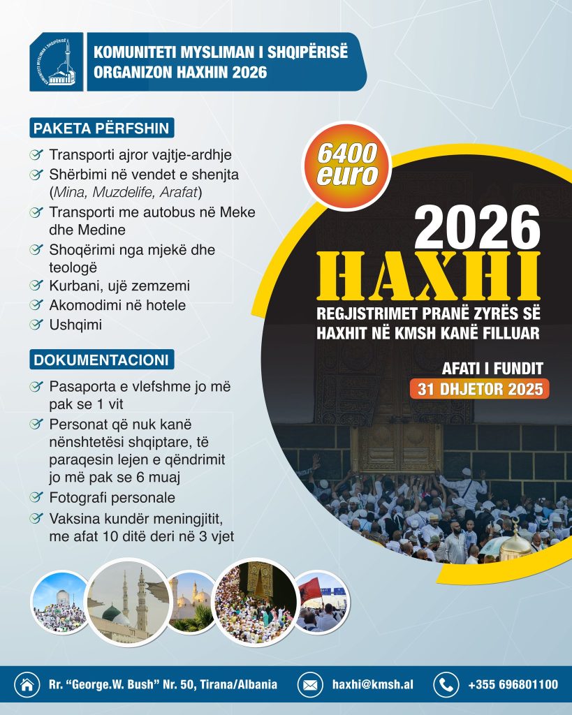 – Komuniteti Mysliman i Shqipërisë njofton të gjithë të interesuarit se tarifa e Haxhit për vitin 1447/2026 është 6400 Euro.